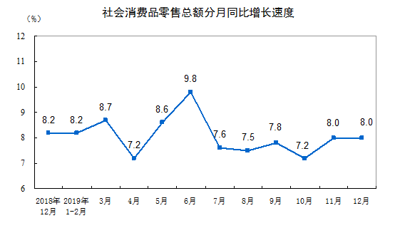 2019年12月份,社会消费品零售总额38777亿元,同比增长8.0%。其中,除汽车以外的消费品零售额34349亿元,增长8.9%。