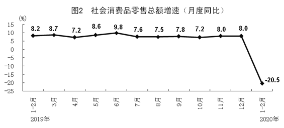 根据第四次全国经济普查结果对2019年社会消费品零售总额进行了修订,2020年1-2月份增速按照可比口径计算。