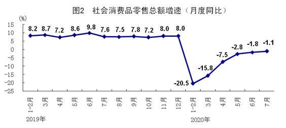 7月份,社会消费品零售总额32203亿元,同比下降1.1%,降幅比6月份收窄0.7个百分点;环比增长0.85%。1-7月份,社会消费品零售总额204459亿元,同比下降9.9%,降幅比1-6月份收窄1.5个百分点。7月份,按经营单位所在地分,城镇消费品零售额28025亿元,同比下降1.1%;乡村消费品零售额4178亿元,下降1.3%。按消费类型分,餐饮收入3282亿元,下降11.0%;商品零售28920亿元,增速年内首次由负转正,增长0.2%。基本生活类商品销售较快增长。7月份,限额以上单位商品零售额中,饮料类、粮油食品类、日用品类商品同比分别增长10.7%、6.9%、6.9%。消费升级类商品销售持续改善,7月份,汽车类商品增长12.3%,6月份为下降8.2%;通讯器材类、化妆品类商品分别增长11.3%、9.2%。网上零售持续向好。1-7月份,全国网上零售额60785亿元,同比增长9.0%,比1-6月份加快1.7个百分点;其中,实物商品网上零售额增长15.7%,比1-6月份加快1.4个百分点。