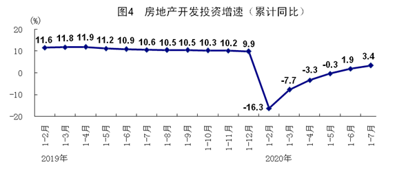 1-7月份,全国固定资产投资(不含农户)329214亿元,同比下降1.6%,降幅比1-6月份收窄1.5个百分点;7月份环比增长4.85%。分领域看,基础设施投资同比下降1.0%,制造业投资下降10.2%,降幅分别比1-6月份收窄1.7、1.5个百分点;房地产开发投资增长3.4%,比1-6月份加快1.5个百分点。全国商品房销售面积83631万平方米,同比下降5.8%;商品房销售额81422亿元,下降2.1%,降幅分别比1-6月份收窄2.6、3.3个百分点。分产业看,第一产业投资增长7.7%,比1-6月份加快3.9个百分点;第二产业投资下降7.4%,降幅比1-6月份收窄0.9个百分点;第三产业投资增长0.8%,1-6月份为下降1.0%。高技术产业投资增长8.0%,比1-6月份加快1.7个百分点;其中高技术制造业和高技术服务业投资分别增长7.4%、9.1%。高技术制造业中,医药制造业、电子及通信设备制造业投资分别增长14.7%、7.3%;高技术服务业中,电子商务服务业、科技成果转化服务业投资分别增长26.4%、24.4%。社会领域投资增长8.7%,比1-6月份加快3.4个百分点;其中卫生、教育投资分别增长18.2%、13.5%,比1-6月份分别加快3.0、2.7个百分点。投资增长后劲较足,1-7月份,新开工项目计划总投资同比增长15.8%,投资到位资金增长2.1%。