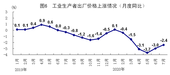 7月份,全国工业生产者出厂价格同比下降2.4%,降幅比6月份收窄0.6个百分点;环比上涨0.4%。工业生产者购进价格同比下降3.3%,降幅比6月份收窄1.1个百分点;环比上涨0.9%。1-7月份,全国工业生产者出厂价格和工业生产者购进价格同比分别下降2.0%、2.7%。