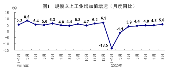 8月份,全国规模以上工业增加值同比增长5.6%,增速比7月份加快0.8个百分点;环比增长1.02%。1-8月份,全国规模以上工业增加值同比增长0.4%,增速实现由负转正。8月份,分经济类型看,国有控股企业增加值同比增长5.2%;股份制企业增长5.8%,外商及港澳台商投资企业增长5.3%;私营企业增长5.7%。分三大门类看,采矿业增加值同比增长1.6%,制造业增长6.0%,电力、热力、燃气及水生产和供应业增长5.8%。8月份,装备制造业和高技术制造业增加值同比分别增长10.8%、7.6%,快于规模以上工业5.2、2.0个百分点。从产品产量看,挖掘、铲土运输机械,工业机器人,智能手机,集成电路,微型计算机设备产量分别增长34.1%、32.5%、12.1%、12.1%、12.0%。