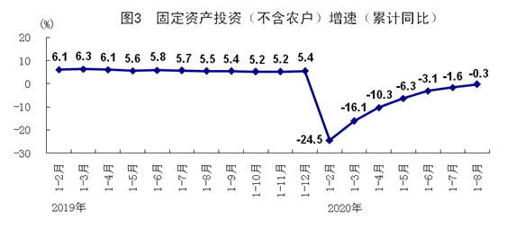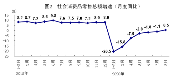 8月份,社会消费品零售总额33571亿元,同比增长0.5%,增速年内首次由负转正;环比增长1.25%。1-8月份,社会消费品零售总额238029亿元,同比下降8.6%,降幅比1-7月份收窄1.3个百分点。8月份,按经营单位所在地分,城镇消费品零售额29273亿元,同比增长0.5%;乡村消费品零售额4298亿元,增长0.7%。按消费类型分,餐饮收入3619亿元,同比下降7.0%;商品零售29951亿元,增长1.5%。消费升级类商品销售较快增长。8月份,通讯器材类、化妆品类、金银珠宝类、汽车类商品分别增长25.1%、19.0%、15.3%、11.8%。网上零售持续增加。1-8月份,全国网上零售额70326亿元,同比增长9.5%,比1-7月份加快0.5个百分点;其中,实物商品网上零售额增长15.8%,比1-7月份加快0.1个百分点,占社会消费品零售总额的比重为24.6%。