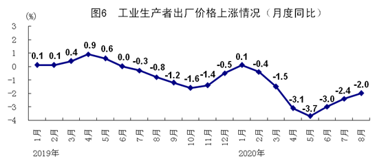 8月份,全国工业生产者出厂价格同比下降2.0%,降幅比7月份收窄0.4个百分点;环比上涨0.3%。工业生产者购进价格同比下降2.5%,降幅比7月份收窄0.8个百分点;环比上涨0.6%。1-8月份,全国工业生产者出厂价格和工业生产者购进价格同比分别下降2.0%、2.7%。