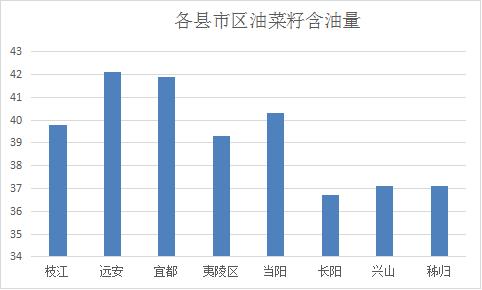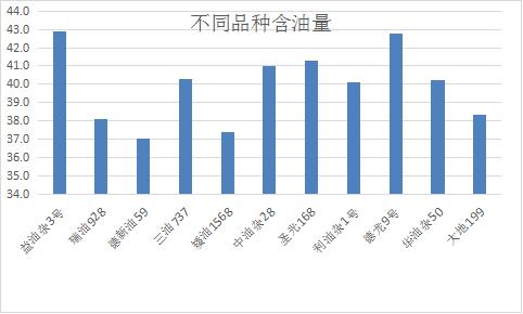 平均含油量39.5%,变幅为35.3—43.3%,达三级以上(≥38%)标准的为81.1%,达二级以上(≥40%)标准的为51.4%,达一级(≥42%)标准的为13.5%。分地区和品种其含油量如图所示: