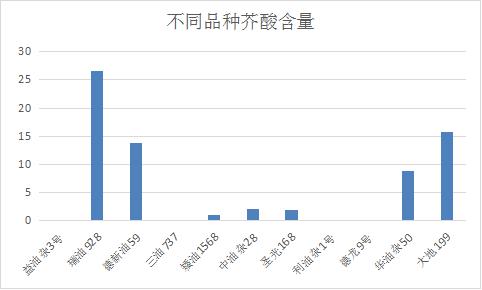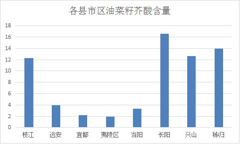 平均芥酸含量7.7%,变幅为0—26.5%,共检测样品37份,达到低芥酸油菜籽标准(芥酸≤3.0%)的共19份,占比为51.4%。分地区和品种芥酸含量如图所示: