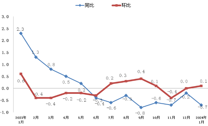 2023年1月—2024年1月CPI单月同比、环比涨跌幅(%)