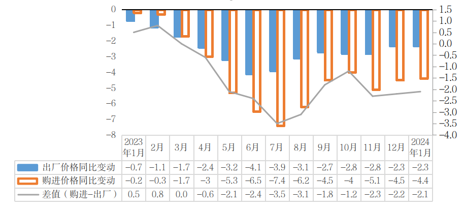 2023年1月—2024年1月PPI、IPI单月同比涨跌幅及差值(%)