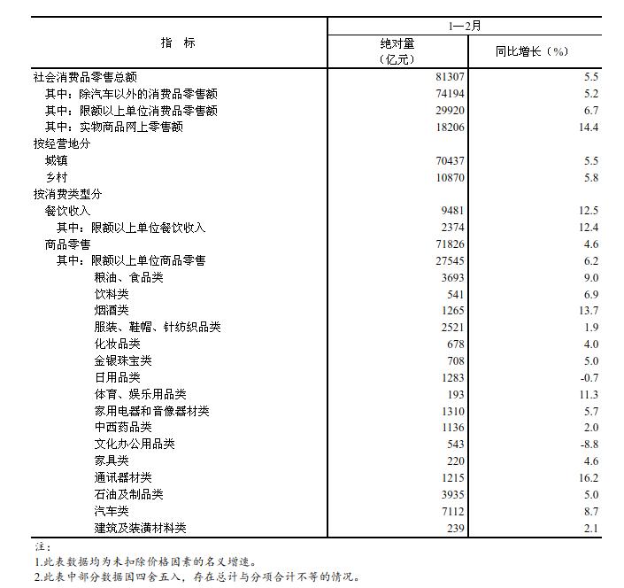 1—2月份,社会消费品零售总额81307亿元,同比增长5.5%。其中,除汽车以外的消费品零售额74194亿元,增长5.2%。