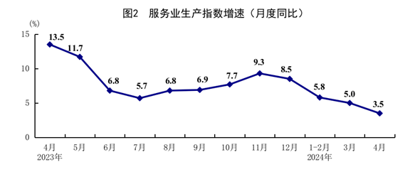 4月份,全国服务业生产指数同比增长3.5%。分行业看,信息传输、软件和信息技术服务业,租赁和商务服务业,金融业,交通运输、仓储和邮政业生产指数同比分别增长10.8%、6.1%、5.4%、4.3%,分别快于服务业生产指数7.3、2.6、1.9、0.8个百分点。1-4月份,全国服务业生产指数同比增长5.0%。1-3月份,规模以上服务业企业营业收入同比增长8.5%。4月份,服务业商务活动指数为50.3%;服务业业务活动预期指数为57.4%。其中,铁路运输、道路运输、邮政、电信广播电视及卫星传输服务等行业商务活动指数位于55.0%以上较高景气区间。