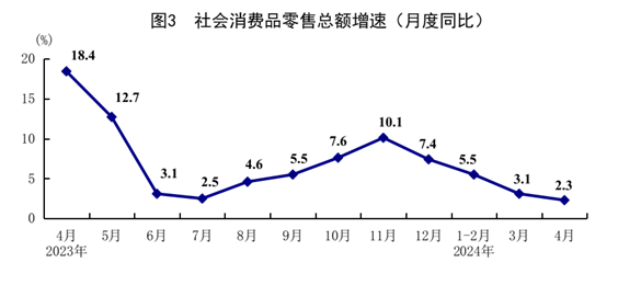 4月份,社会消费品零售总额35699亿元,同比增长2.3%;环比增长0.03%。按经营单位所在地分,城镇消费品零售额31026亿元,同比增长2.1%;乡村消费品零售额4673亿元,增长3.5%。按消费类型分,商品零售31784亿元,增长2.0%;餐饮收入3915亿元,增长4.4%。基本生活类和部分升级类商品销售增长较快,限额以上单位通讯器材类,体育、娱乐用品类,粮油、食品类,饮料类商品零售额分别增长13.3%、12.7%、8.5%和6.4%。1-4月份,社会消费品零售总额156026亿元,同比增长4.1%。全国网上零售额44110亿元,同比增长11.5%。其中,实物商品网上零售额37356亿元,增长11.1%,占社会消费品零售总额的比重为23.9%。1-4月份,服务零售额同比增长8.4%。