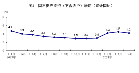 1-4月份,全国固定资产投资(不含农户)143401亿元,同比增长4.2%;扣除房地产开发投资,全国固定资产投资增长8.9%。分领域看,基础设施投资同比增长6.0%,制造业投资增长9.7%,房地产开发投资下降9.8%。全国新建商品房销售面积29252万平方米,同比下降20.2%;新建商品房销售额28067亿元,下降28.3%。分产业看,第一产业投资同比增长1.9%,第二产业投资增长13.0%,第三产业投资增长0.3%。民间投资增长0.3%;扣除房地产开发投资,民间投资增长7.2%。高技术产业投资同比增长11.1%,其中高技术制造业和高技术服务业投资分别增长9.7%、14.5%。高技术制造业中,航空、航天器及设备制造业,计算机及办公设备制造业投资分别增长49.6%、10.2%;高技术服务业中,电子商务服务业、信息服务业投资分别增长27.6%、19.9%。4月份,固定资产投资(不含农户)环比下降0.03%。