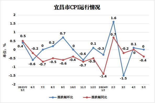 2023年5月-2024年5月CPI单月同比、环比涨跌幅(%)