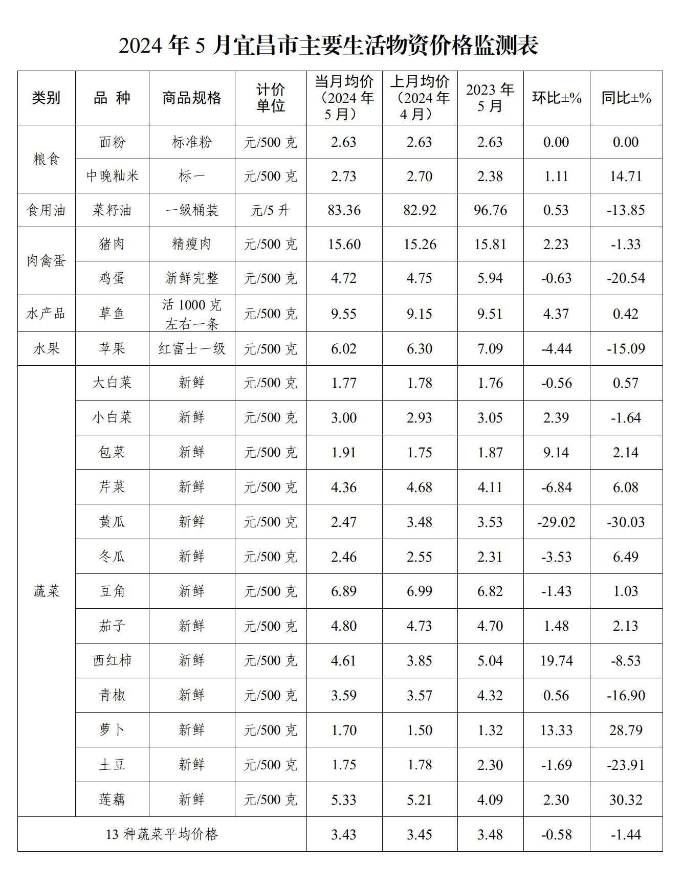 (三)蔬菜价格。本地蔬菜大量上市,市场供应充足。5月份重点监测的13种常规蔬菜均价3.43元/500g,环比下跌0.58%,同比下跌1.44%,比全省均价高0.37元/500g。环比涨幅靠前的品种是西红柿、萝卜,价格分别上涨19.74%、13.33%;跌幅靠前的品种是黄瓜、芹菜,价格分别下跌29.02%、6.84%。