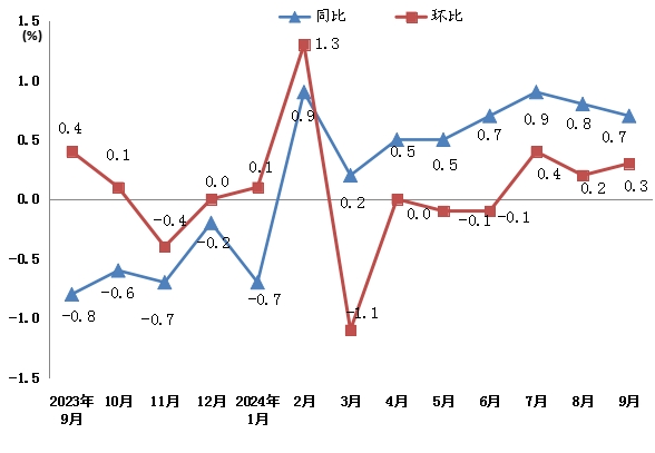 2023年9月—2024年9月CPI单月同比、环比涨跌幅(%)