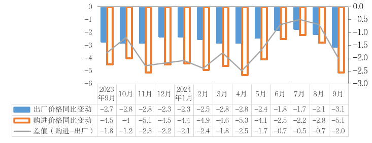 9月,工业生产者出厂价格中,生产资料价格同比下降3.7%,影响PPI下降约2.55个百分点,生活资料价格同比下降1.6%,影响PPI下降约0.52个百分点。工业生产者购进价格中,有色金属材料及电线类价格同比上涨2.3%;化工原料类、燃料动力类、黑色金属材料类、建筑材料及非金属类、农副产品类、纺织原料类、其它工业原材料及半成品类、木材及纸浆类价格同比分别下降12.6%、9.0%、5.8%、5.1%、4.9%、3.7%、3.3%、2.4%。