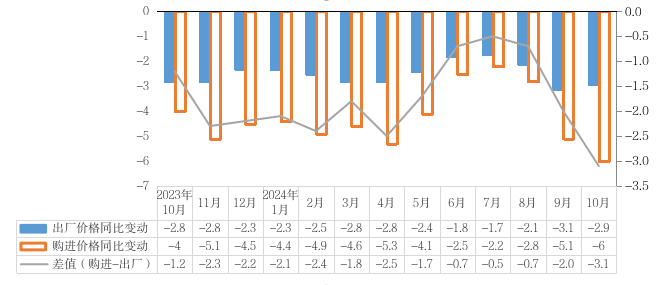 10月,工业生产者出厂价格中,生产资料价格同比下降3.4%,影响PPI下降约2.34个百分点。生活资料价格同比下降1.9%,影响PPI下降约0.59个百分点。工业生产者购进价格中,有色金属材料及电线类价格同比上涨8.5%;化工原料类、燃料动力类、黑色金属材料类、建筑材料及非金属类、农副产品类、木材及纸浆类、其它工业原材料及半成品类、纺织原料类价格同比分别下降19.3%、11.5%、6.9%、5.3%、5.0%、3.8%、3.2%、3.1%。