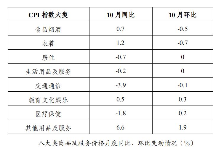 10月,全市CPI同比下降0.4%,降幅较上月扩大0.1个百分点,比全省低0.8个百分点;环比由上月的上涨转为下降0.1%,指数较上月下降0.3个百分点,比全省高0.1个百分点。