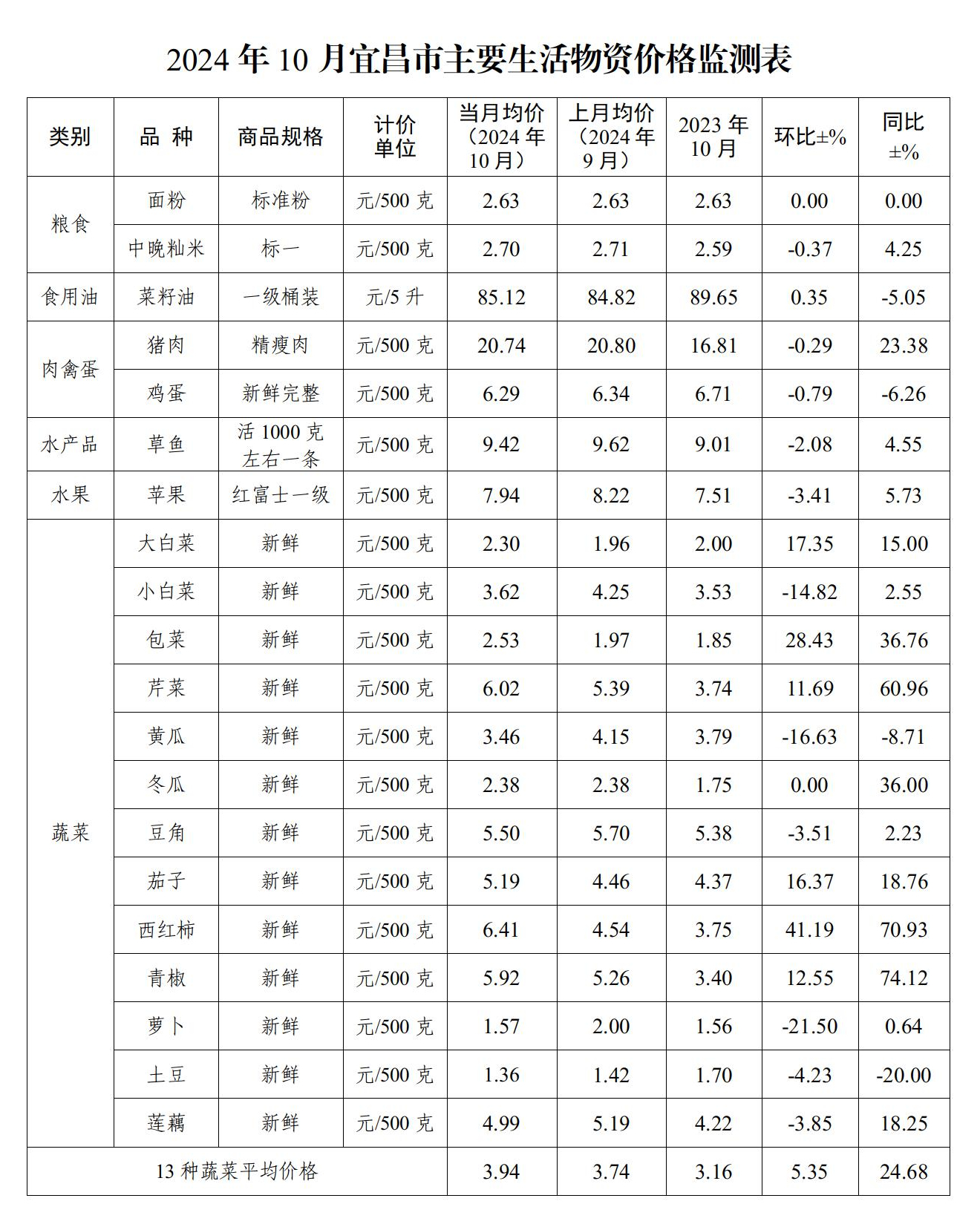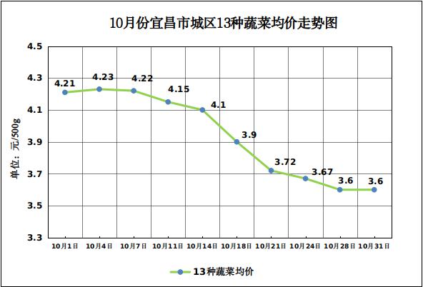 3.蔬菜价格涨幅回落。受国庆假期影响,上半月蔬菜价格依然高位运行,10月中旬后假期效应消退,加之天气晴好,气温适宜蔬菜生长,秋季蔬菜大量上市,供应增加使鲜菜价格指数环比下降0.6%,影响CPI下降约0.01个百分点,指数较上月回落4.6个百分点。10月份,重点监测的13种大众蔬菜6涨6跌1平,均价3.94元/斤,环比上涨5.35%,同比上涨24.68%,同环比涨幅均有所回落。环比涨幅靠前的蔬菜是西红柿、包菜,分别上涨41.19%、28.43%;跌幅靠前的蔬菜是萝卜、黄瓜,分别下跌21.5%、16.63%。