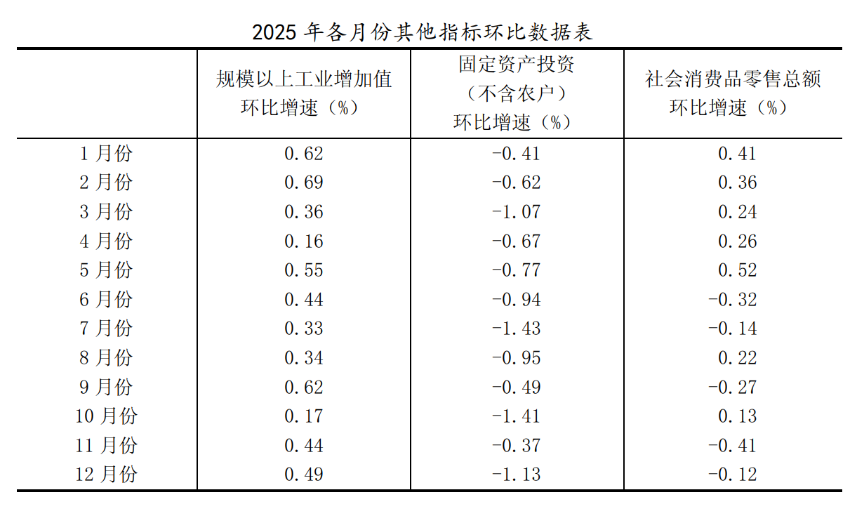 (2)根据季节调整模型自动修正结果,对近一年来各期国内生产总值、规模以上工业增加值、固定资产投资(不含农户)、社会消费品零售总额环比增速进行修订。修订结果及2025年四季度GDP环比数据、2025年12月份其他指标环比数据如下: