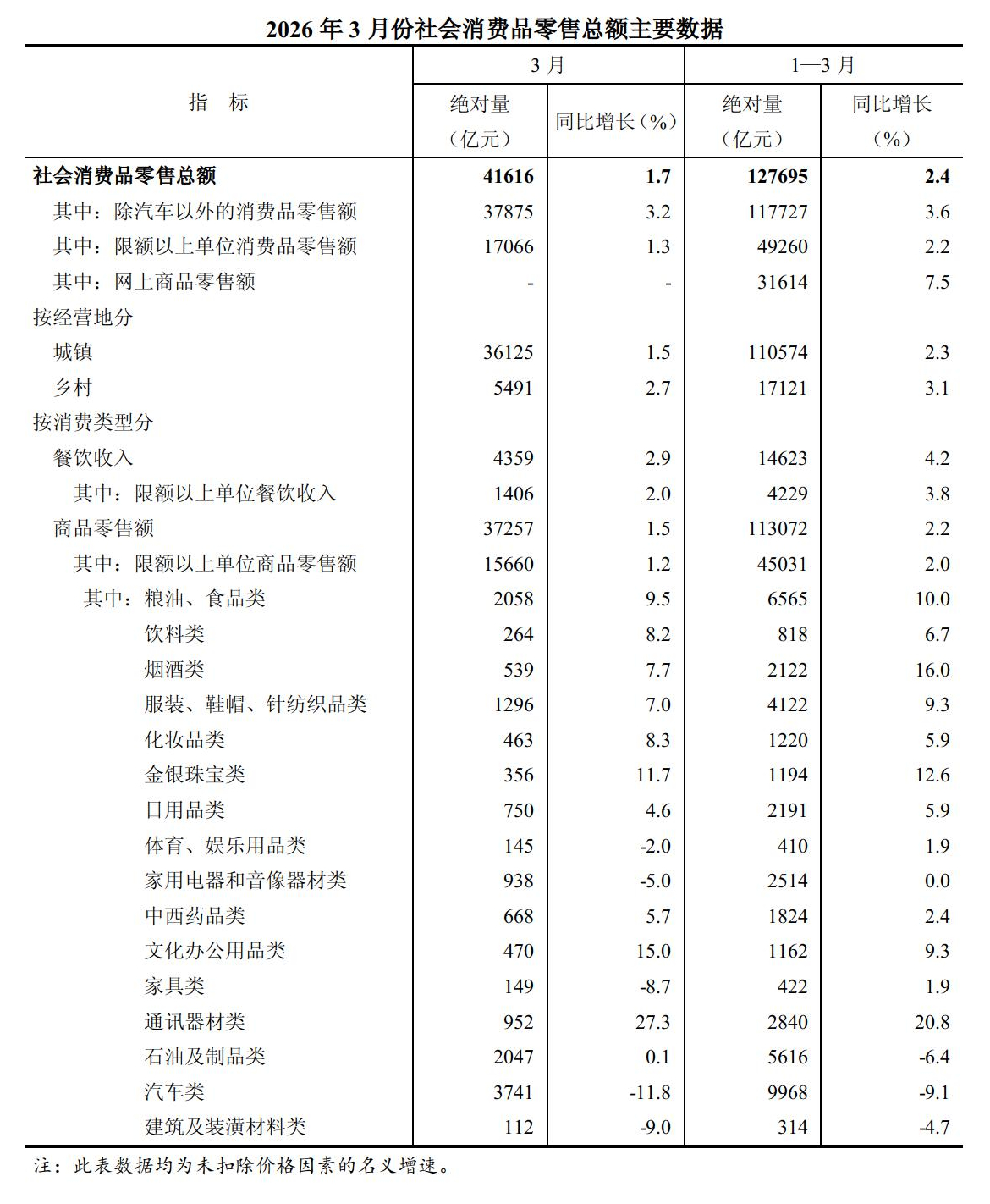 3月份,社会消费品零售总额41616亿元,同比增长1.7%。其中,除汽车以外的消费品零售额37875亿元,增长3.2%。1—3月份,社会消费品零售总额127695亿元,同比增长2.4%。其中,除汽车以外的消费品零售额117727亿元,增长3.6%。