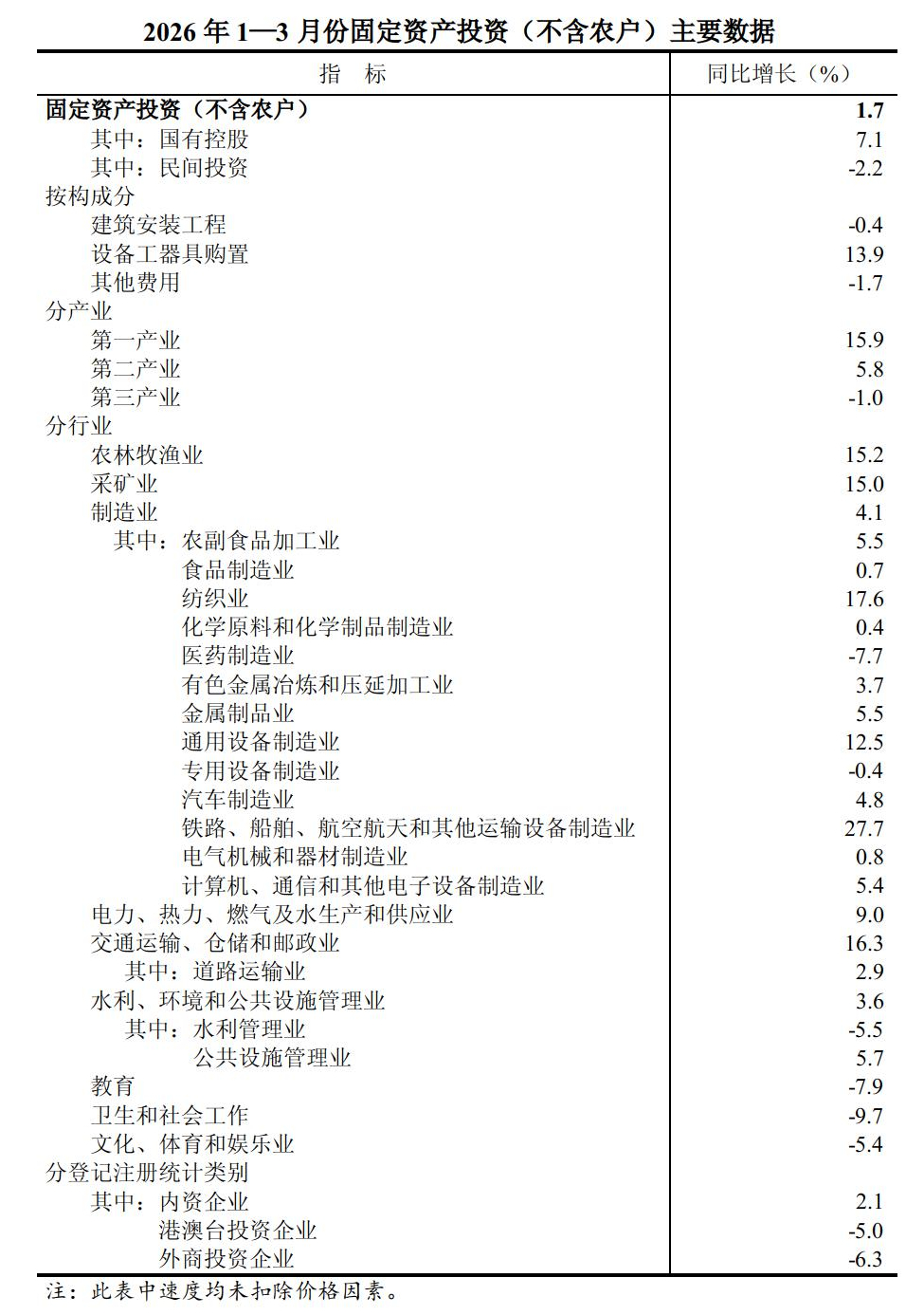 1—3月份,全国固定资产投资(不含农户)102708亿元,同比增长1.7%(按可比口径计算,详见附注7)。其中,民间固定资产投资同比下降2.2%。从环比看,3月份固定资产投资(不含农户)增长0.52%。