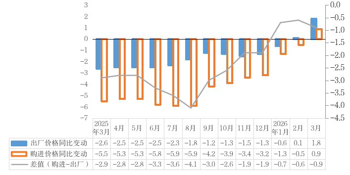 3月,工业生产者出厂价格中,生产资料价格同比上涨2.4%,影响PPI上涨约1.84个百分点。生活资料价格同比下降0.1%。工业生产者购进价格中,有色金属材料及电线类、化工原料类、纺织原料类、其它工业原材料及半成品类价格同比分别上涨24.1%、3.5%、1.1%、0.1%;农副产品类、黑色金属材料类、木材及纸浆类、建筑材料及非金属类、燃料动力类价格同比分别下降4.0%、3.3%、2.2%、1.7%、0.9%。