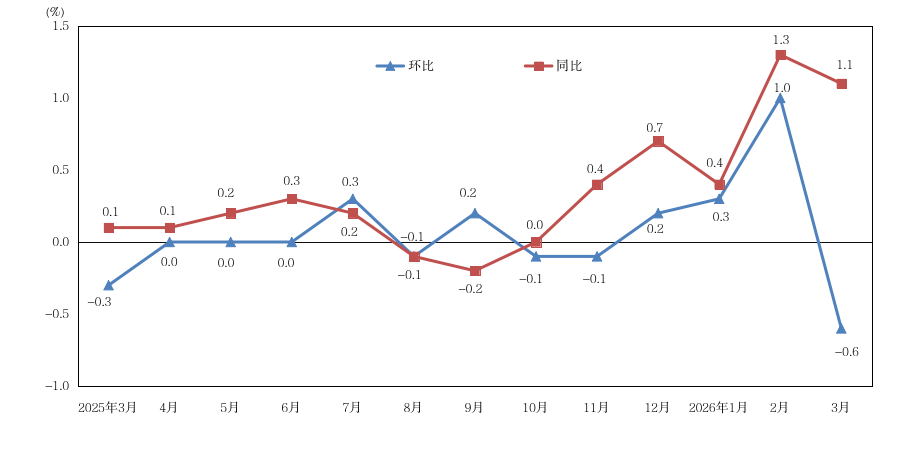 2025年3月—2026年3月CPI单月同比、环比涨跌幅(%)