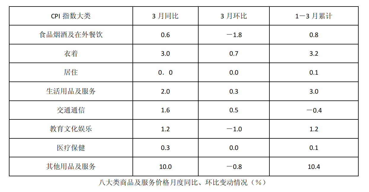 3月,八大类商品及服务价格同比7涨1平,其他用品及服务、衣着、生活用品及服务价格同比涨幅靠前。食品烟酒及在外餐饮价格同比上涨0.6%。其中,鲜菜价格同比上涨2.4%,影响CPI上涨约0.04个百分点;猪肉价格同比下降11.0%,影响CPI下降约0.23个百分点。