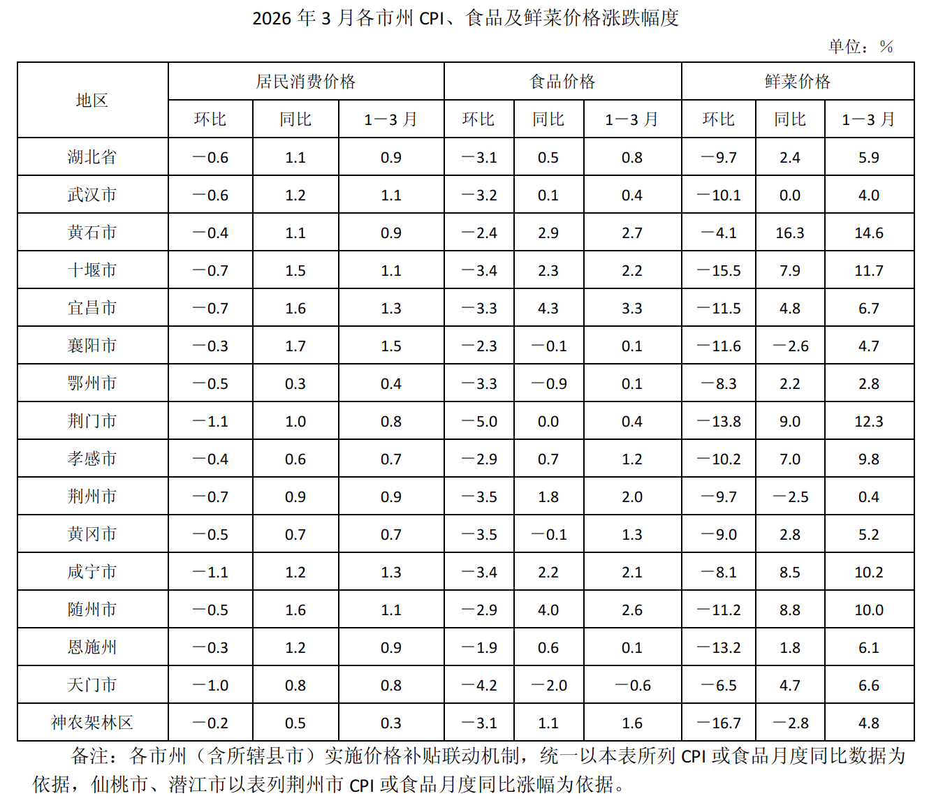 1.2026年3月各市州CPI、食品及鲜菜价格涨跌幅度