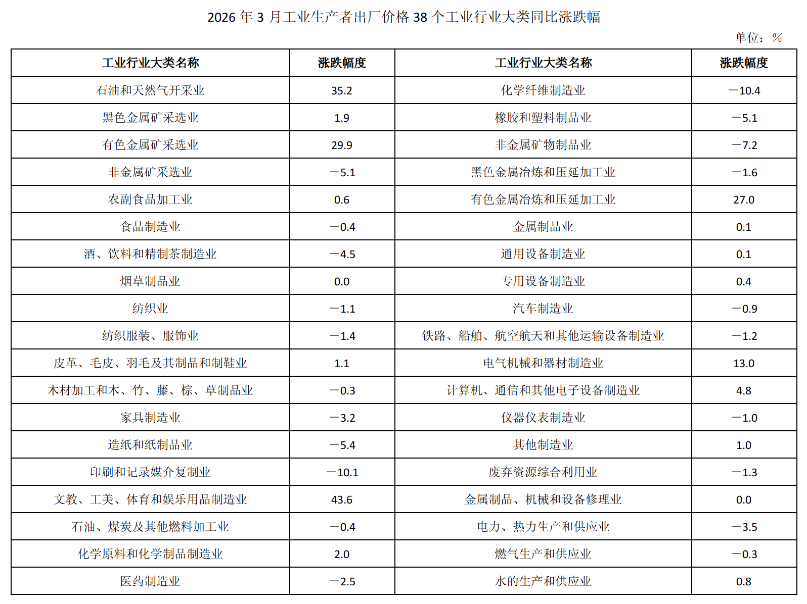 2.2026年3月工业生产者出厂价格38个工业行业大类同比涨跌幅