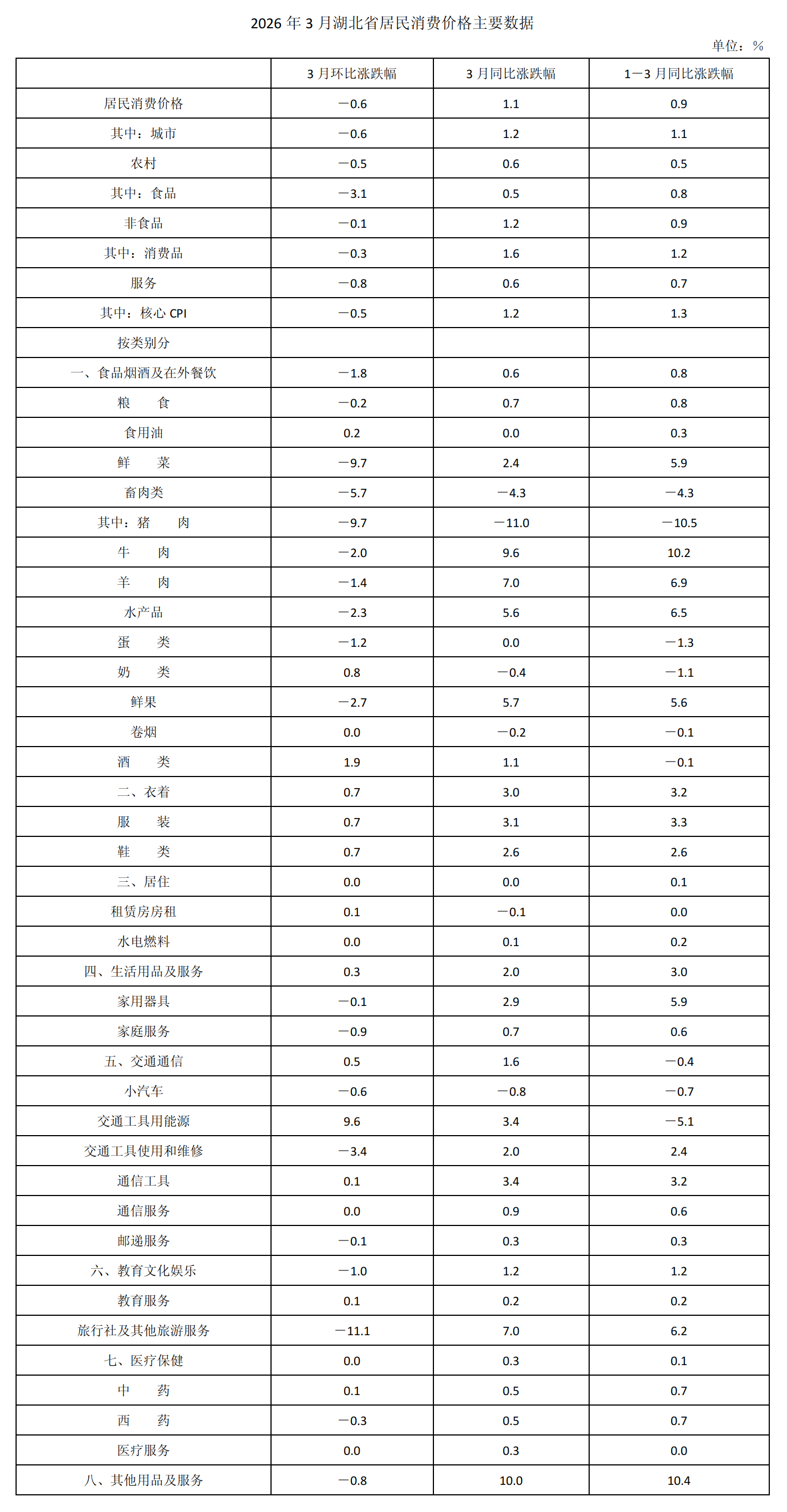全省1-3月CPI同比指数与全国一致。1-3月,全省CPI同比上涨0.9%,并列全国第13位;在中部六省中排名第4位,指数比安徽、河南、山西分别低0.6、0.3、0.1个百分点,比湖南、江西分别高0.1、0.3个百分点。