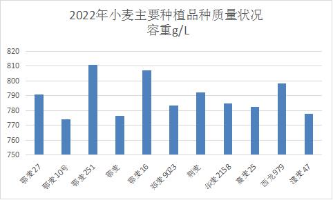 平均容重为788g/L,变幅为811—770g/L,所有样品均可达二级标准以上(≥770g/L),达一级以上(≥790g/L)标准的为46.7%。主要种植品种质量状况如下图: