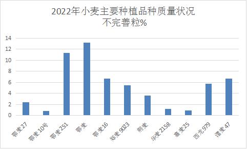 平均不完善5.0%,变幅为0.8—13.2%,共检测样品15份,达到二级小麦标准(不完善粒≤6.0%)的共10份,占比为66.7%。分品种不完善粒含量如图所示: