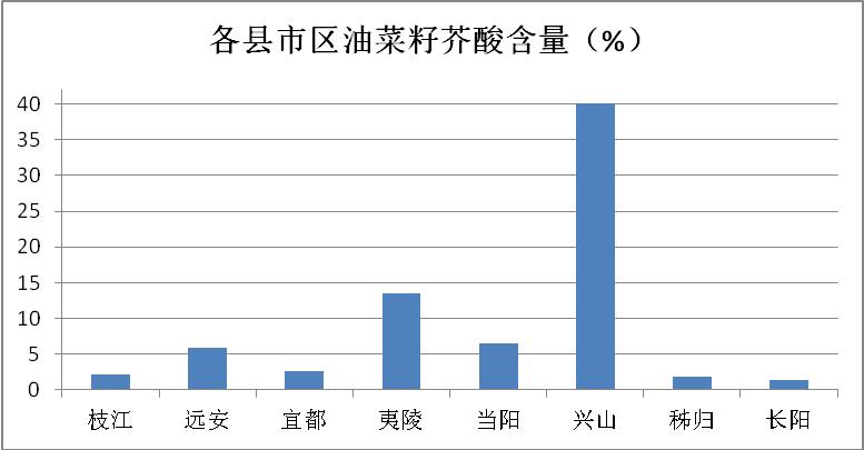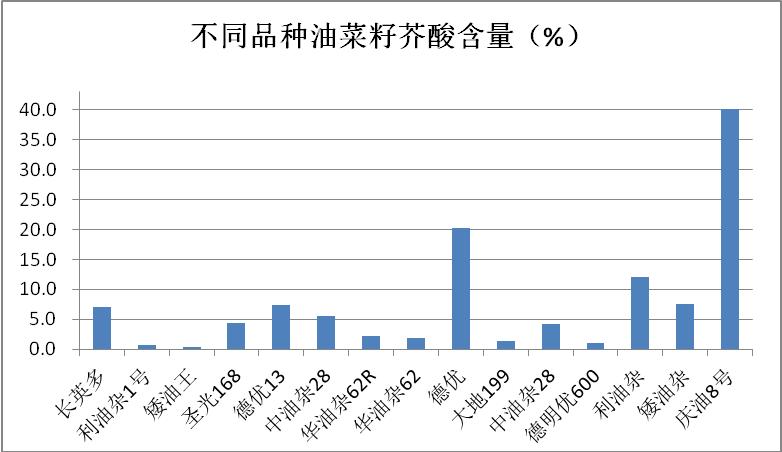 平均芥酸含量7.2%,变幅为0.2—40.1%,共检测样品18份,达到低芥酸油菜籽标准(芥酸≤3.0%)的共7份,占比为38.9%。